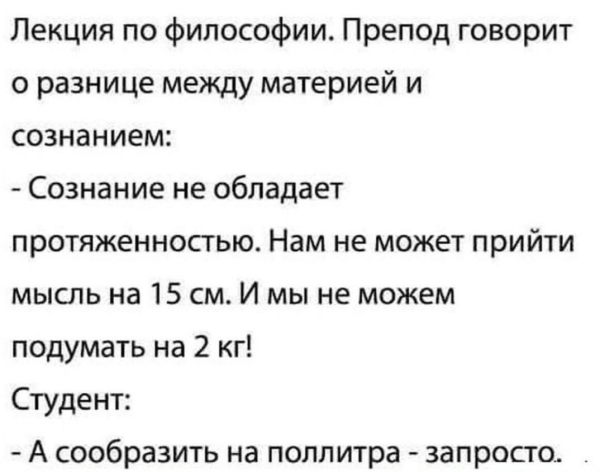 Психологи говорят, что человеку нужно понравиться трем людям: себе, начальнику и сексуальному партнёру. А если ты сам себе начальник и сексуальный партнёр, то ещё проще…1 point