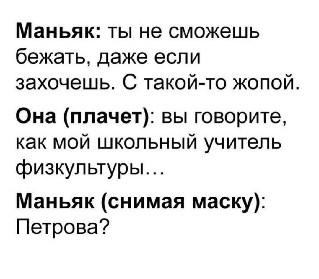 Ах чуть не забыл Завтра весь день буду сидеть в ФБ и под фотками девушек с цветами/духами писать "Зая, а что это значит?" П.С. Завтра во всех аптеках страны: - Здравствуйте. - Закончились.4 points