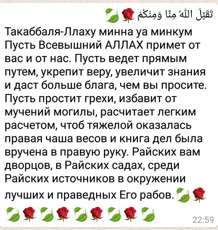 Ассаламу алейкум ва рахматуллахи ва баракату! Поздравляю мусульман с наступившим праздником . ДА ПРИМЕТ АЛЛАХ ОТ ВАС И ОТ НАС.