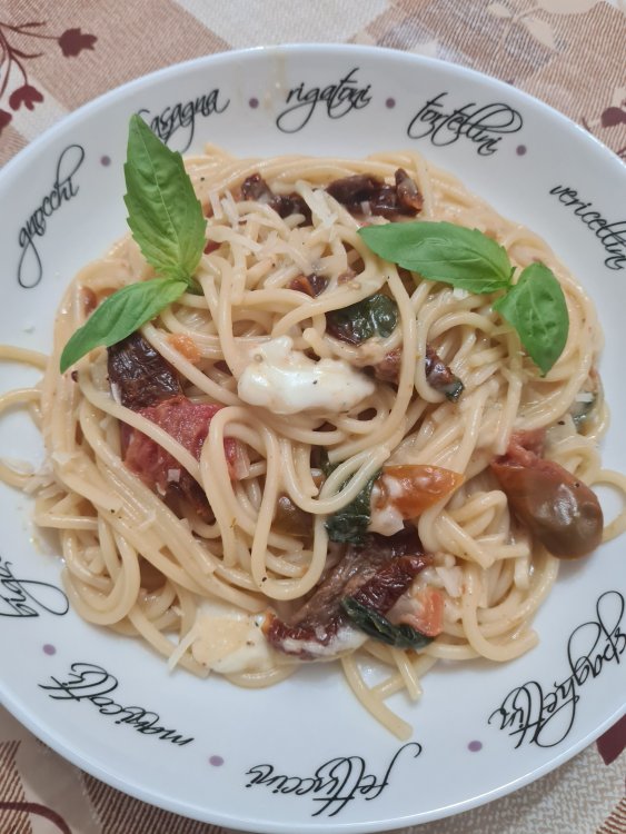 Лук , чеснок, помидоры шери, сушеные помидоры, спаггети, моцарелла бейби, масло оливковое, вода, соль перец, базилик.