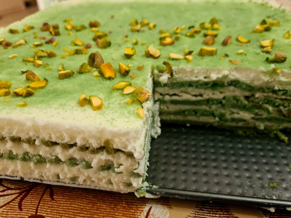 Простой))) фисташковые печеньки, сливки 500мл 32-8% взбить с пудингом ( вкус французкий креп) и стакан молока. Складывать слоями в форму))))