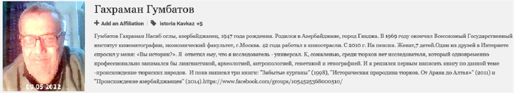 1750 тюргологических публикаций Гумбатова Гахрамана Гумбатов Гахраман Насиб оглы, азербайджанец, 1947 года рождения. Родился в Азербайджане, город Гянджа. В 1969 году окончил Всесоюзный Государственный институт кинематографии, экономический факультет, г.Москва. 42 года работал в киноотрасли. С 2010 г. На пенсии. Женат,7 детей.Один из друзей в Интернете спросил у меня: «Вы историк?». Я ответил ему, что я исследователь - универсал. К, сожаленью, среди тюрков нет исследователя, который одновременно профессионально занимался бы лингвистикой, археологией, антропологией, генетикой и этнографией. И я решился первым написать книгу по данной теме -происхождение тюркских народов. И пока написал три книги: "Забытые курганы" (1998), "Историческая прародина тюрков. От Арана до Алтая»" (2011) и "Происхождение азербайджанцев" (2014). https://www.academia.edu/84259846/1750_тюргологических_публикаций_Гумбатова_Гахрамана