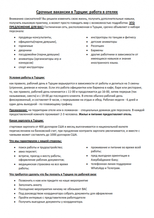 Уважаемые форумчане, Спешу сообщить Вам что мы организовали мероприятие в Отеле Иршад завтра. Все желающие работать в гостиничной сети отелей в Турции могут посетить наше мероприятие. Присутствие соискателей ничему не обязывает. Тема встречи: Трудоустройство в Турции, требования к кандидатам, требуемые документы, условия работодателя, возможность заполнить анкеты и сфотографироваться ( все документы в тот же день будут отправлены работодателю), подписываются только прямые контракты с работодателем и конечно ВОПРОС-ОТВЕТ Довожу до сведения что требуемое количество работников увеличено до 500 человек Мы очень стараемся оправдать все ваши ожидания МЕСТО МЕРОПРИЯТИЯ: Отель Иршад Адрес Отеля: Молла Пянах Вагифа пр-т. 11 A Время на основе выбранной группы Дата 05.04.2018 Телефон: +994 70 525 20 43 Приходите сами и приводите друзей. Для вашего удобства мы решили разделить людей на группы, именно так эффективность работы с каждым и обратная связь будет наиболее продуктивная. 1 группа в 12-00 2 группа в 13-00 3 группа в 14-00 4 группа в 15-00 5 группа в 16-00 6 группа в 17-00 Опоздавшие переходят в следующую временную группу Наша группа в ФБ: https://www.facebook.com/groups/1641772249224022/ Подписывайтесь и и всегда первым будьте в курсе всех обновлений и новостей.