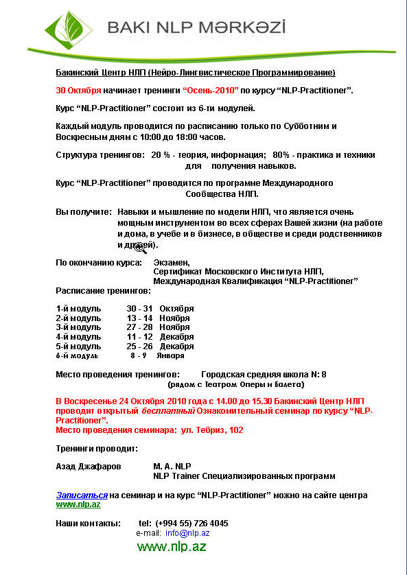 LEYLA1970 Опубликовано: 25 сентября, 2010 Жалоба Share Опубликовано: 25 сентября, 2010 (изменено) Бакинский Центр НЛП (Нейро-Лингвистическое Программирование) 30 Октября начинает тренинги “Осень-2010” по курсу “NLP-Practitioner”. Нейролингвисти?ческое программи?рование, также известное как НЛП (англ. Neuro-linguistic programming) (также встречается вариант «нейро-лингвистическое программирование») — комплекс моделей, техник и операционных принципов (контекстуально-зависимых убеждений), применяемых главным образом как подход к личностному развитию посредством моделирования эффективных стратегий (мыслительных и поведенческих). Об НЛП можно написать много интересного, но для людей не близких с этим направлением психологии сейчас это было бы не понятно... Хочу сказать одно - эти курсы лично мне помогли трезво посмотреть на жизнь, открыла возможность изменения себя и других. Во многих странах мира это направление практикуется уже давно, в Баку было всего три выпуска. У нас есть официальный сайт www.NLP.az на котором есть полная информация процесса обучения. Изменено 25 сентября, 2010 пользователем LEYLA1970 Цитата Ссылка на комментарий Поделиться на других сайтах More sharing options...