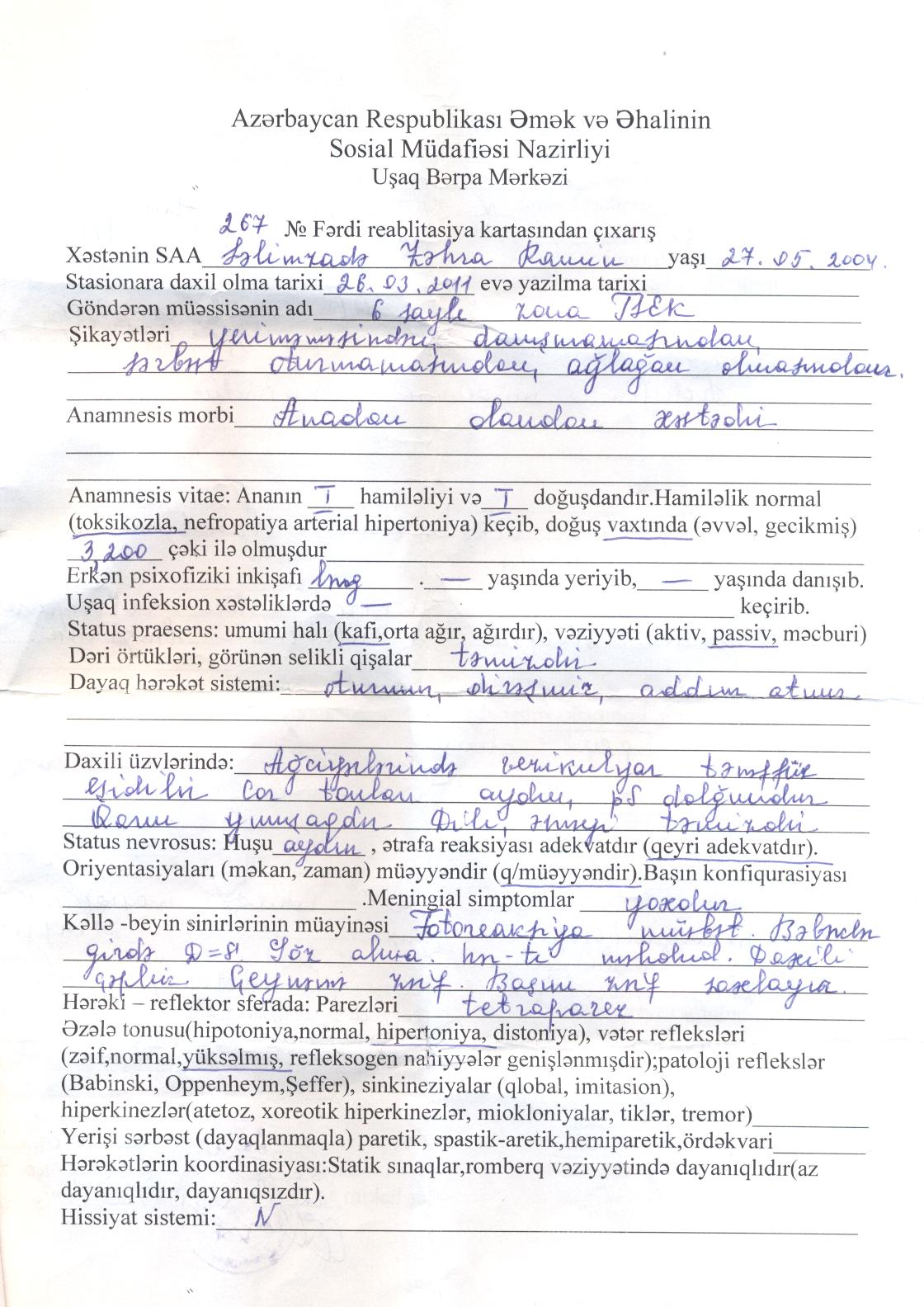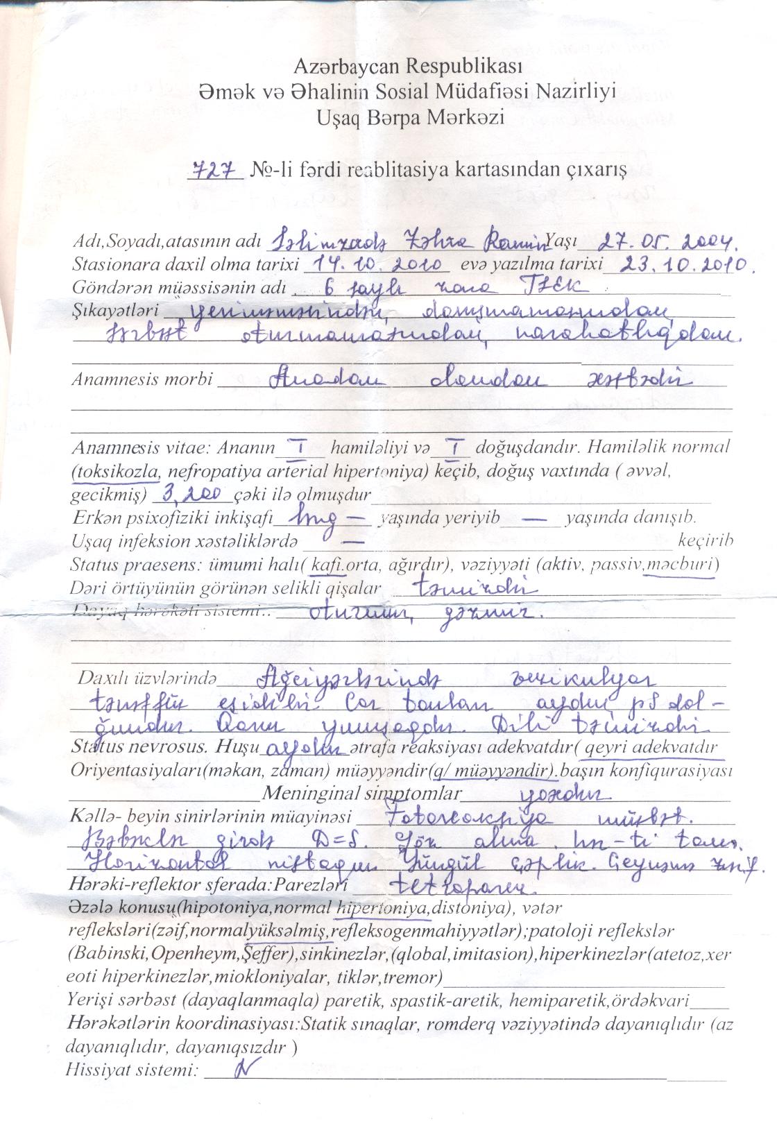 miss_kiss Опубликовано: 25 сентября, 2011 Жалоба Share Опубликовано: 25 сентября, 2011 Дорогие друзья! Недавно ко мне обратилась одна семья за помощью,а точнее, их дочь,7 летняя Зяхра, от рождения страдает ДЦП... это племянница нашей Анасынын кузусу Пару недель назад я посетила их семью, скромные простые люди в Хырдалане,уже 7 лет стараются поставить дочку на ноги...но как всегда наши врачи таким детям толком ничем не помогают...Она красавица,но почти не говорит,ножки и ручки атрофированы, а точнее дистрофия, но голову прекрасно держит...и есть шансы поставить ее на ноги также как и Гюнельку... Как и прежде я собираюсь послать их в Москву... в 18 Московскую Детскую Больницу на месячное лечение... В связи с чем очень прошу не проходить мимо ...каждый манат имеет место... Она девочка и у ее будущее может зависеть от нас всех... Ниже выставлю все доки... Всем заранее спасибо!!! Ссылка на комментарий Поделиться на других сайтах More sharing options...
