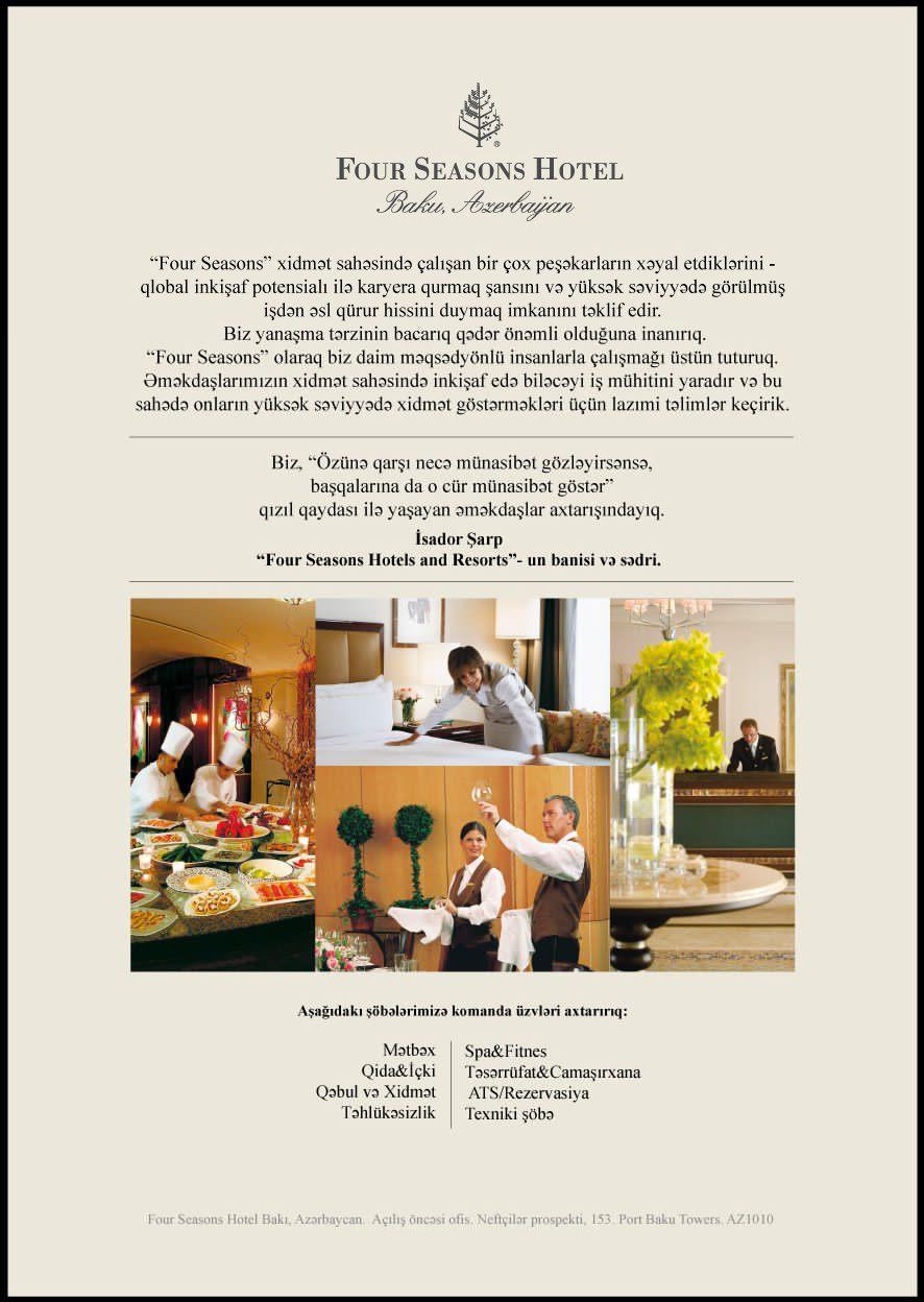 Four Seasons Опубликовано: 14 октября, 2011 Жалоба Share Опубликовано: 14 октября, 2011 Отель Four Seasons Baku 5* проводит набор сотрудников на свободные вакансии. Мы предлагаем скользящий рабочий график, а так же организуем тренинги интернационального класса. Заработанная плата от 350 до 500 манат. Предпочтение отдаётся выпускникам университета туризма. Требования к кандидатам: - Отличное знание азербайджанского, английского и русского языков - Минимум 1 год опыта в отельном бизнесе - Девушки и парни с приятной внешностью - Грамотная речь, умение вежливо обслужить клиентов отеля - На некоторые позиции требуется знание офисных программ - Умение пользоваться офисной оргтехникой - Наличие делового этикета при общении, доброжелательность, вежливость, организованность, пунктуальность, серьёзное и ответственное отношение к работе - Умение работать в команде Просим выслать ваши CV с фотографией на электронный адрес: jobs.baku@fourseasons.com Наш офис находится в Port Baku на первом этаже. Более детальную информацию можно получить по телефону 050 283-00-40 и 050 283-00-18 Цитата Ссылка на комментарий Поделиться на других сайтах More sharing options...